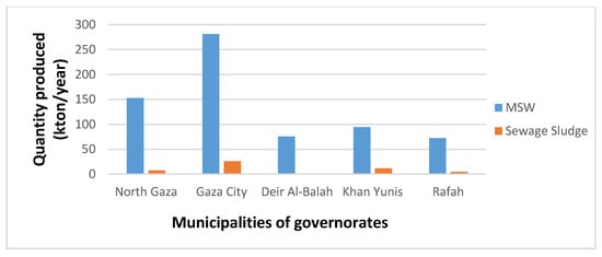 Biomass data comprise statistical data belong to Municipal Solid Waste (MSW), sewage sludge, and Agricultural waste. Municipal waste being the main dry biomass source in (kg/person/year) was supplied by the Municipal Development and Lending Fund (MDLF, Gaza, Palestine). MDLF is a semi-governmental funding channel involved in the GS and is one of the 19 various waste recovery stockholders in 2017. Sewage sludge data, the sewage treatment stations number, and treated water volume (m3/day), were provided from the Palestinian Water Authority (PWA, Gaza, Palestine) in 2018, and from CMWU in 2017. Data on agricultural waste were derived from the Agriculture Ministry (MoA, New Delhi, India) in 2017. Agriculture data comprise annual yields waste (kg/ha) of plant, for 2013–2014, and the animal dung production.