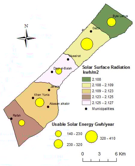 The key results of this study consist of evaluating the four most effective RESs that could be implemented in the Middle East: solar, wind, wave, and biomass. The energy maps presented show their potentials as well. This study has shown that the energy potentials are 1919.5 GWh/year from biomass, 136.72 GWh/year from wind, and 1195 GWh/year from solar. Solar and biomass account for over 96% of the overall output of renewable energy (RE). Furthermore, the ability of productive wind energy is important at 3.5% of overall electricity output. Hence, the construction of wind turbines for this northern coastal region is also recommended. For these reasons, RESs are recommended for grid injection to electrify households’, buildings projects, as well as remote areas. This work enhances RE market growth in selected target communities by promoting the role of locally generated biomass, wind, sea, and solar energy as the key contributors to local energy supply. It is worth mentioning that the potential of integrated RESs in the Gaza Strip reaches 3240.4 GWh/year, which represents more than 95% of the household energy demand in the respective area. To conclude, pursuing renewable resources as a means of energy use is a way of addressing the Gaza energy crisis and offering cultural, social, or environmental benefits. As a conclusion biomass and solar energy are the most important sources of renewable energies in GS [53,54].