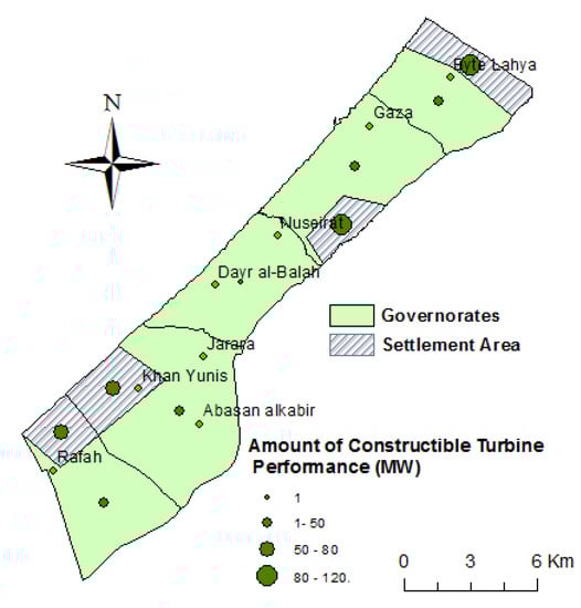 The potential for wind energy depends much on the topography of a region. As a result, considerable potential exists in the flat region. These areas are located mainly in the north-western part overlooking the Mediterranean coastal area of the GS (Figure 10). In total, 10% (3600 ha) of the GS’s area is available for wind farm installations, with the most significant potential areas being in the municipalities of North Gaza (6100 ha), Gaza (7500 ha), and Khan Younis (10,500 ha) while the other Governorates are in highly populated areas. The western coast of the GS is considered to be an area that can be exploited to set up wind farms, where the highest wind speeds have been reported in the northern areas of the coast. The average wind speed in the GS ranges from 2 to 6 m/s [52].
