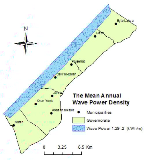 The west coast of the GS, 31.192°–31.354° N, 34.138°–34.293° E, has a coastline roughly 41 km long. The GS overlooks the Mediterranean to the West, and extending from the South to the North, making Gaza an exploitable area for renewable wave energy [8,9,10]. The GS coast is located in the eastern Mediterranean region; a very high-resolution integrated atmospheric/wave modelling system was developed for simulating the atmospheric circulation and sea wave evolution in the area over a period of 10 years in the Levantine Basin, Eastern Mediterranean is presented in Zodiatis et al. [43]. The most energetic offshore areas of the Levantine Basin are characterized by relatively low 10-year mean wave energy potential of about 2.5 kW/m and shows a generally stable yearly behavior of wave power values. The wave model WAM, ECMWF (European Centre for Medium-Range Weather Forecasts) [44], version CY33R1 has been used [43,44,45]; the wave energy potential is affected directly according to controlling and simulation of two main parameters which are the considerable wave height and wave energy period.