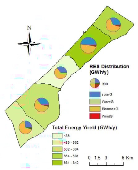 The potential and spatial distribution of various RESs is an important aspect of RES-based country development strategies. Figure 12 shows the distribution of total RESs at the local level. The figure shows biomass, solar, wind, and then wave contribution to energy output, and it is also seen that the energy yield in the Gaza Governorate is more than others, in a dark green color, and biomass and solar are the most significant contributors, when biomass exhibits a dominant renewable resource that represents aspects of society such as farming and high population. In all cases, biomass and solar represent the main energy sources, in some cases accounting for 90% of the RESs. The GS has five Governorates with roughly the same RES. The reason for this homogeneous distribution is the overall small area and the living habits.