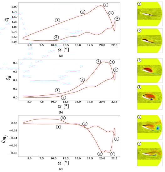 , the load along the z axis shows an almost monotonic behaviour. Differently, the sudden formation of a trailing edge vortex affects both the drag (Figure 6b) and moment loads. The appearance of a trailing edge vortex is depicted by a second peak in the two plots