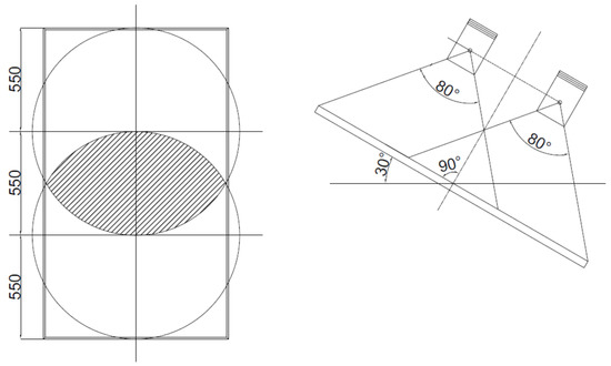 In conjunction with the selection of the nozzle spraying angle, the authors evaluated also their position (top or bottom of the panel), inclination, and number. As previously, these parameters are investigated with the aim of finding the configuration which allows a uniform film distribution and, subsequently, the best compromise between PV performance improvement and water consumption. Placing the nozzles on the PV module bottom edge does not guarantee to sprinkle water on the entire module surface (the upper part of the module resulted non-cooled) as well as to eventually collect the sprayed water after surface cooling. Therefore, to establish a uniform film from top to bottom, nozzles need to be placed on the module’s top edge, as shown in