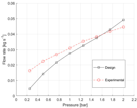 During these tests, the authors observed that the water sprayed by the nozzle at a certain inlet pressure does not correspond to the one provided by the manufacture. To point out the source of the flow rate discrepancy, for each spraying pressure (0.25, 0.50, 0.75, 1.00, 1.25, 1.50, 1.75, and 2.00 bar), the sprayed water is collected in a water vessel. The collected water is weighted and the water mass flow rate computed. The measured flow rate is then compared with the one directly measured by the flow meter installed on the hydraulic water circuit. The comparison among manufacturer data and measured values are shown in