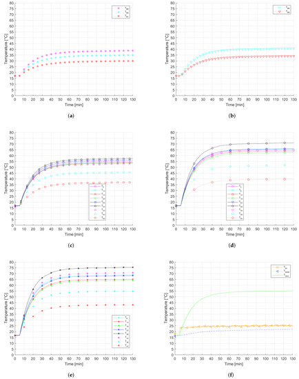 Figure 9f, it is essential to highlight that mean surface temperature after the heating process is 56 °C which means 32–37 °C above the measured air temperature between the panel and the lamps and 11 °C higher than NOCT temperature. Regarding heating rates, the maximum is 0.45 °C min