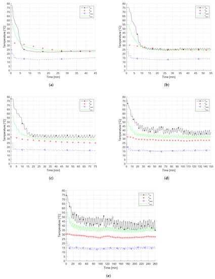Figure 9. The heating period stops when the entire set of thermocouples reaches stability and maintains it. This means after 120 min. The strategy of starting the cooling cycles after achieving the steady-state of mean surface temperature at the highest value is useful to assess the cooling system capability and velocity of reducing the temperature as well as to investigate the effects on the module’s surface (thermal shock and glass deterioration) of cooling it with fresh water.