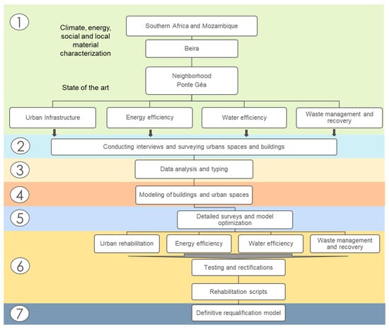 Initially, in point 1 (Figure 4), a characterization of the local materials, existing rehabilitation solutions, and climatic, social, economic, energy, water, and waste management conditions are to be carried out.