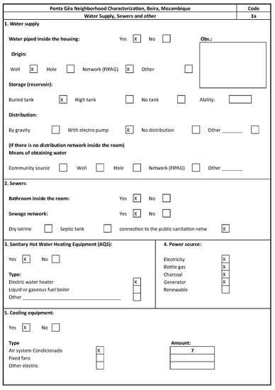 Subsequently, in point 2, data collection is to be carried out in the study area, involving the survey and general characterization (urban and building), in a total of 3300 buildings in the neighborhood under study with the support of a topographic survey of the urban space, survey forms (Figure 5 and Figure 6), and contacts with local public institutions (provincial government, the municipal council of Beira, universities in Beira, neighborhood’s chief). Using the survey forms, data are to be collected regarding the individual classification of buildings in the neighborhood according to their use and surroundings, types of coverings, window frames, types of roofs, passive strategies, water supply, drinking water storage, sewage network, sources of power, and cooling equipment and heating equipment. The types of coverings, the constitution of glazed openings, external sun protection devices, and types and cover materials are investigated in more detail. With this preliminary survey, it will be possible to group the buildings according to their use, structural typology, roofs, and external surroundings. Furthermore, data on the water supply, sewage network, cooling equipment, energy sources for cooling hot water in the interior, and even food preparation are to be collected at this stage.