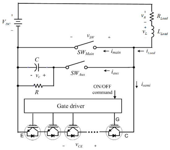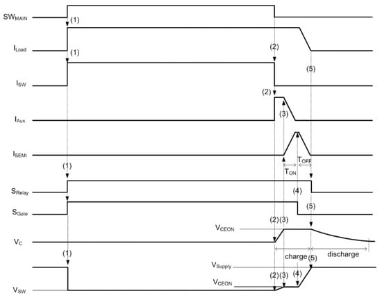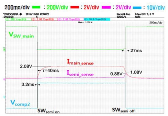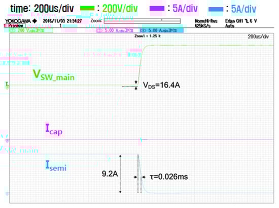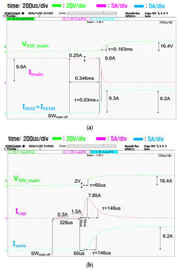 On the other hand, Figure 8b shows separate waveforms of the currents flowing through the capacitor branch (Icap) and the current flowing through the semiconductor switch branch (Isemi). In Figure 8b, when the main switch is turned off, the commutation capacitor is charged by the capacitor charging current (Icap) and the voltage at both ends of the main switch (Vsw_main) rises above a certain level (VCEON = 16.4 V in this experiment) to turn on the semiconductor switch string (SWSEMI). Since the gate of the semiconductor switch string already turned on, it can be seen that the current is bypassed to the semiconductor switch branch. Here, the time when the load current flowing through the main switch is completely decreased to zero is about 0.1 ms. When the current is bypassed to the semiconductor switch branch, the voltage across the main switch maintains the on-voltage drop of the semiconductor switch string (VCEON = 16.4 V), and the load current flows through the semiconductor switch branch.