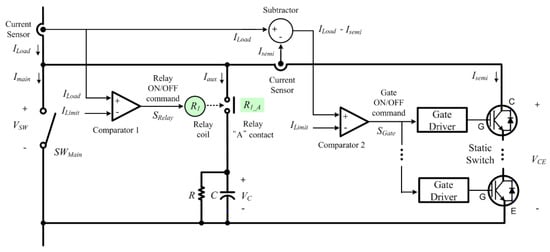 Figure 2 shows a control circuit for controlling the operating sequence of the MVDC hybrid circuit breaker. In Figure 2, Comparator 1 is to determine the connection and disconnection of the capacitor branch circuit, and the role of Comparator 2 is to determine ON/OFF of the semiconductor switch branch. Two current sensors detect the load current (ILoad) and the current flowing through the semiconductor switch branch circuit (Isemi). Comparator 1 compares the load current value with the threshold current value ILimit. The threshold current value is set to a positive small value. Therefore, when the load current (ILoad) does not flow initially, the output (SRelay) of the Comparator 1 is in a low state, and the contact (R1_A) of the relay is in the OFF state. When the load current increases as the circuit is turned on, the output of the Comparator 1 becomes high and the make contact (R1_A) of the relay is turned ON to connect the capacitor branch circuit. When the main switch cut off and the load current does not flow in the main switch, the output (SRelay) of Comparator 1 becomes low and separates the capacitor branch circuit.