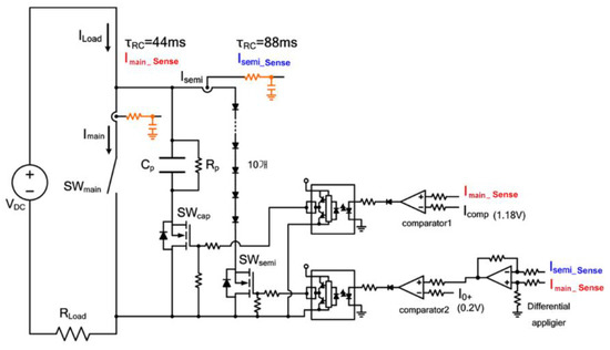 In the experimental circuit, the semiconductor switch string is named SWSEMI, and the auxiliary switch is named SWCAP. For convenience, a FET switch was used for the auxiliary switch (SWCAP). In the process of detecting the main switch current and the current flowing through the semiconductor switch string in the experimental circuit, low pass filters were used to reduce noise and cause a time delay. Comparator 2 is an element that determines the timing of ON/OFF of the semiconductor switch string (SWSEMI). In particular, the time delay of the current sensor plays an important role when determining the OFF timing.