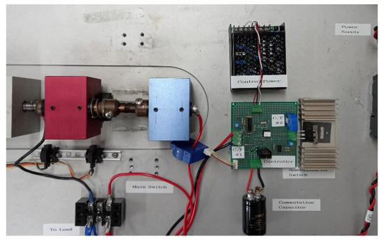 Figure 5 shows a photograph of the experimental setup for the proposed MVDC hybrid circuit breaker. The main switch is composed of two bronze electrodes driven by geared step motor so that the opening speed can be controlled by the step motor. The maximum opening speed of the moving electrode is 80 mm/sec. By varying the opening speed of the main switch, the characteristics of the proposed hybrid circuit breaker can be exploited. Current transducer 1 (C.T #1) is for main switch current detection (Imain_sense), and current transducer 2 (C.T #1) is for semiconductor switch current detection (Isemi_sense).