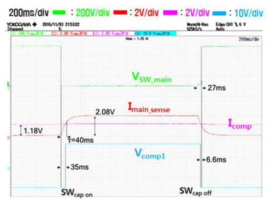 Figure 6 describes the output of Comparator 1 (Vcomp1) to turn on/off the capacitor branch circuit according to ON/OFF state of the main switch. When the main switch is turned on to make the circuit, the voltage across the main switch rapidly becomes zero, and the current flowing through the main switch rises to the value of the load current. However, the main switch current detection value (Imain_sense) increases slowly with a time constant of about 44 ms by the LPF. Since the main switch current detection value according to the full load current is set to 2.08 V, it takes about 35 ms for the main switch current detection value to reach the comparison value of 1.18 V. In other words, about 35 ms after the load current starts flowing to the main switch, the output of Comparator 1 becomes high, and the capacitor branch circuit is connected.