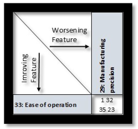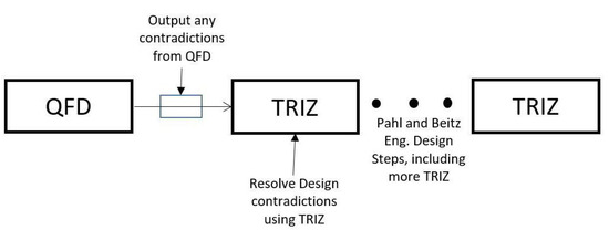 Leon [32] presented two cases to demonstrate how the rooftop of a HOQ can be used as an input into TRIZ so that Technical Contradictions that are identified in the HOQ analysis can be addressed using the Contradiction Matrix in TRIZ (Figure 6). A key conclusion of Leon was that “the QFD process and the construction of the HOQ should begin before a new product design is started” [32]. This is in contrast to Runliang and Hui [30], who suggested starting with AD and then iterating to the final design using the integration of the various tools.