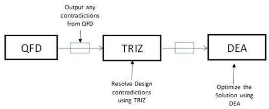 Zheng et al. [24] took a similar approach for the integration of these same tools as Mayda and Borklu [22], using QFD and TRIZ for a similar result. However, as shown in Figure 2, Zheng et al. used the resulting output from the step with TRIZ as input for use in Data Envelopment Analysis (DEA). Zheng et al. actually use the Fuzzy DEA approach to “find the system optimal solution” [24]. Later in this paper, this same concept is applied, except it substitutes Axiomatic Design (AD) instead of DEA in this third step of the process.