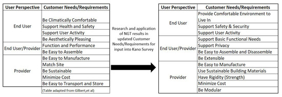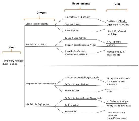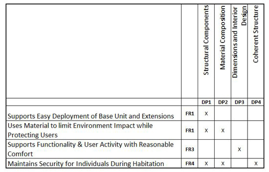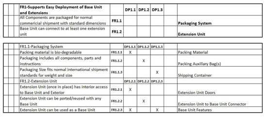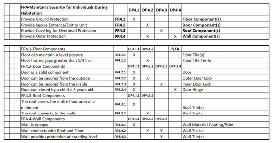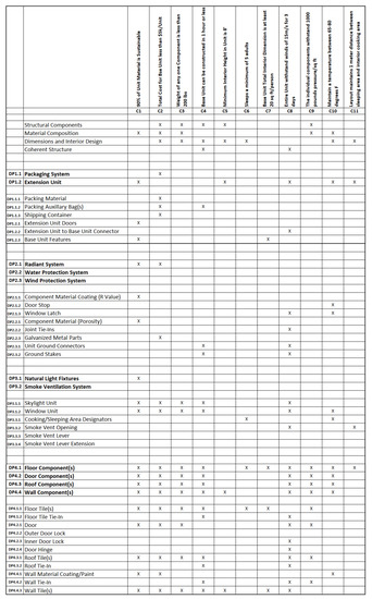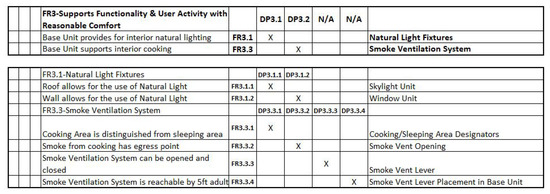- Gilbert, A.; Lindsey, R.; Omar, M.; Farid, A. An Integrated QFD and Axiomatic Design Methodology For the Satisfaction of Temporary Housing Stakeholders. In Proceedings of the The Eighth International Conference on Axiomatic Design, Lisbon, Portugal, 24–26 September 2014; pp. 1–9. [Google Scholar]