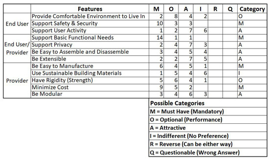 For this survey, a cross-disciplinary group of 20 individuals was selected to participate in the survey from a variety of backgrounds that included previous refugees, refugee relief volunteers, mechanical and systems engineers, system integrators, non-profit organizational leads, construction material sales professional, current humanitarian workers, international business executives, world travelers, and ex-military personnel with extensive work oversees. Participants in the applicable research survey and transdisciplinary activities were from a variety of educational and industry-leading international engineering companies; planning and development companies; secondary and higher educational institutes; charitable organizations with international work. Numerous individuals participating in the survey have decades of overseas experience, construction, and engineering backgrounds in addition to individuals from the Middle East and North Africa region, bringing diverse and important influence into the final research results. The results for the Kano survey are summarized in Figure 10, while the detailed responses are found in Appendix A Figure A1.
