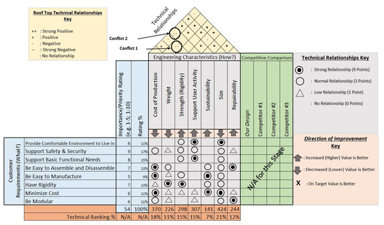 Note that there are two double negatives (“- -”) technical relationships identified between the weight and strength (rigidity) and between “Support User Activity” and “Cost of Production”. These double negatives are noted as “Conflict 1” and “Conflict 2”, respectively, in Figure 11. These technical contradictions, now identified, will be addressed in the next step using TRIZ before the creation of the final QFD/HOQ matrix. The negative relationships were assessed by considering the “Direction of Improvement” in the House of Quality rooftop for strength and weight. For “Conflict 1”, the double negative, attempting to increase strength as much as possible, likely results in the weight increasing and therefore moving in a direction counter to the “Direction of Improvement”. For “Conflict 2”, the same negative relationship is true with respect to the “Cost of Production” and “Support User Activity” as the team determined that increasing complexity associated with supporting additional user activity in a refugee home will drive up production costs (i.e., a basic home, like a tent, is easier to manufacture since it supports sleeping, whereas a refugee home that supports complicated user activity, such as electric cooking, will drive up complexity and increase production costs).