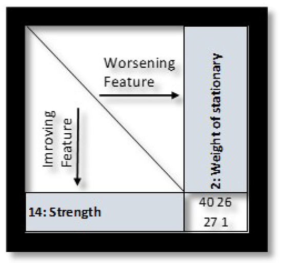 - The TRIZ Journal: The 39 features of Altshuller’s Contradiction Matrix. Available online: https://triz-journal.com/39-features-altshullers-contradiction-matrix/ (accessed on 25 August 2020).
