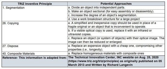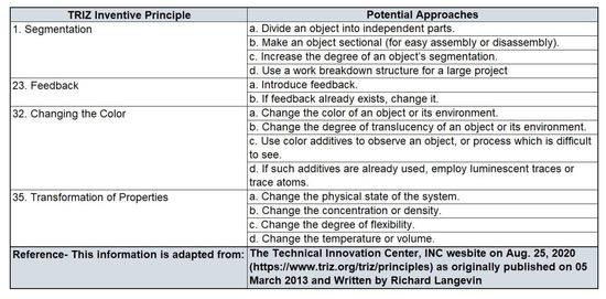 - Dwyer, J.; Domb, E. 40 Inventive (Business) Principles With Examples. Syst. Innov. 1999, 9, 67–83. [Google Scholar]