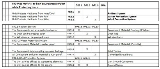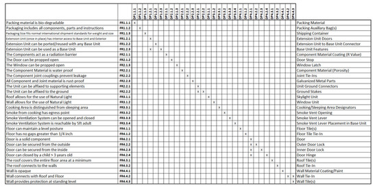 Gilbert et al. [25] presented a study that sought to address the issue of improving designs of temporary housing for refugees in rural areas through the integration of QFD and AD. Their proposed method integrated these two transdisciplinary engineering design tools, a concept that was introduced before them [26,27,28] but was extended in their evaluation of housing options through a unique application of Non-Functional Requirements (nFRs), Constraints (C), and Functional Requirements (FRs) as the top of the HOQ. Their use of AD sought to introduce, among other things, an element of creativity and an approach to quickly achieve the best solution by minimizing the iterative process of design; see Figure 3.