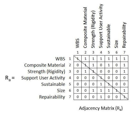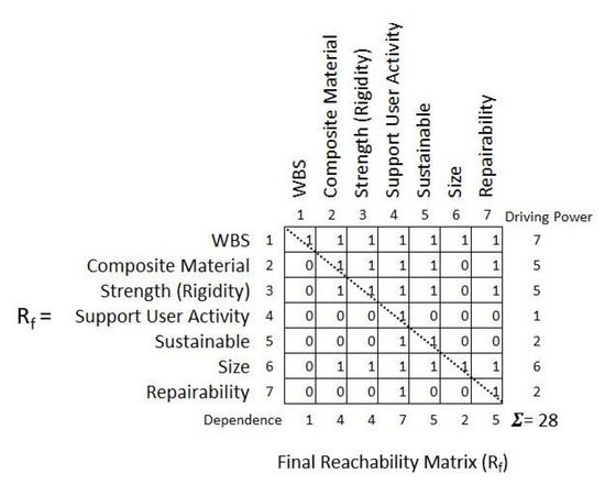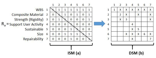 Wang et al. [33] integrated these two tools with DSM first and then ISM as part of a two step-process. The study then employed TRIZ innovation algorithm and modular design. The TRIZ innovation algorithm helps a designer find out appropriate solutions of a concept design in a product development process. Furthermore, it studied how to construct a modular DSM and simplified assembly works. It also showed the relations between components by ISM and converted the whole design mission into an explicit plan [33]; see Figure 7.