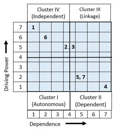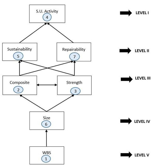 As shown in Figure 30, seven performance measures of factors affecting the design of temporary refugee housing have been classified into four categories. Cluster I includes autonomous factors. As seen from the figure, they have low driving power and low dependence; hence, they can be eliminated from the design consideration. For this case, no factor has been identified in the autonomous quadrant. This indicates that there is no disconnected factor from the design process. Cluster II includes dependent factors that have low driving power and high dependence. As seen from Figure 30, there are three factors (4, 5, and 7) that have a smaller guidance power, but they are dependent on other remaining factors in designing temporary refugee housing. The factors in the linkage cluster III are important due to their high driving power and high dependence—these key factors affect and depend on other factors. Although factors 2 and 3 are at the boundary of the two quadrants, they can be positioned in Cluster III—they are dependent on size factor 6 and directly affect factors 5 and 7 (Figure 29). Cluster IV includes the independent factors of WBS (1) and have strong driving power but very week dependence, size (6), and composite (2) with moderate driving power. Since a large number of edges enter and leave in levels 2 and 3, four main important factors, Sustainability (5), Repairability (7), Composite Material (2), and Strength (3), shown in Figure 29, are the most critical factors which need to be considered first to design successful temporary refugee housing.