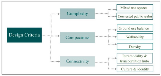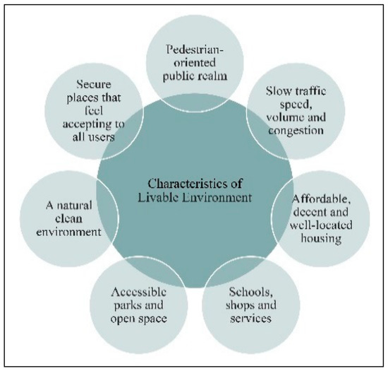 The notion of livability is defined in the literature in terms of both human- and place-oriented points of view. The former is based on the related idea of sustainability [15], while the latter refers to the degree of vitality of a given place. This can be achieved if the following measures are implemented: (a) mixed-use development leading to a pedestrian-oriented built environment; (b) attractive, safe, outdoor spaces supporting healthy activities; (c) the provision of an integrated multimodal transportation system; and, (d) attractiveness across age categories [16,17]. Figure 1 illustrates these ideas.