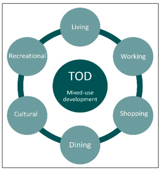 The main design principles of TOD are known as the “3Ds”, which refer to the design, density, and diversity of land uses around transport hubs, such as metro stations [6,7,8]. The successful integration of transportation systems with land use is the key factor needed for the success of TOD, as this leads to reduced car reliance and increased public transit (PT) ridership. The international experience with TODs has shown that such integration creates economic incentives in the area surrounding such hubs, increasing the land value there [8,9,10,11].