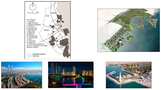 Doha expansion projects, including (upper left) a map of major projects in the city (Source: Furlan, R. Adapted from [31]), three photos of Lusail City (Source: Manfred, T. Adapted from [32]), and (lower right) Doha’s port (Source: Ruskin Titus Gulf. Adapted from [33]).
