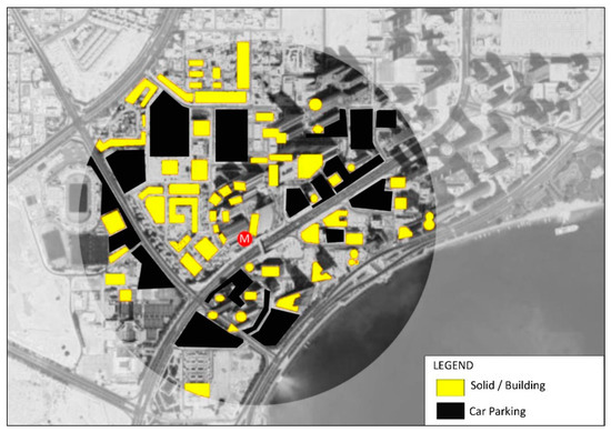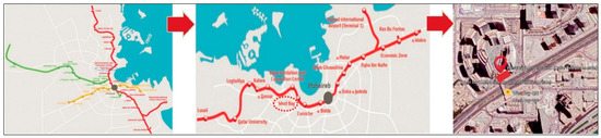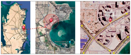 Figure 7 and Figure 8 illustrate the target area of this research paper. The West Bay metro station is located on Majlis Al Taawon Street, adjacent to Qatar Petroleum District, which is located within West Bay. The station, located on the north-south red metro line, began regular operations relatively recently. In the future, this station is expected to attract many users because of its location within Doha’s CBD, especially when other components of the city’s PT system become fully integrated with the metro.