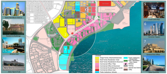 In the past three decades, Doha, which is the capital of the State of Qatar, has undergone massive changes due to rapid economic development; these changes include demographic growth, urban expansion, sporting mega-events, and globalization. Along with its obvious benefits, this rapid growth has led to a number of problems and challenges: urban sprawl, traffic congestion, air pollution, deficiencies in the built environment, and a general lack of affordable housing [1]. Efforts to resolve such problems in urban areas worldwide have led to a movement toward public transportation and Transit-Oriented Development (TOD) as tools for sustainable development. In recent years, government authorities in Qatar have invested in large-scale transit development throughout the country, with a particular focus on the city of Doha. This includes the Doha metro project, long-distance rail, Bus Rapid Transit (BRT), and the Light Rail Train (LRT). TOD development is a crucial component of Doha’s urban planning strategy, through which activities in the vicinity of metro stations are clustered in mixed-use developments, which lead to walkable neighborhoods and less reliance on cars, in turn reducing traffic congestion and air pollution [2,3,4,5].