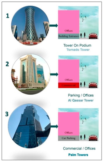 West Bay station is located in the Qatar Petroleum District, as mentioned earlier. It is surrounded by a multi-use area, including a school, a petrol station, malls, cafés, mosques, parks, and sports clubs, and it is fed in part by the Doha Corniche. High-rise towers are the dominant building style; governmental authorities and commercial offices occupy many of these, but some are residential. The land uses in West Bay, as shown in Figure 10, break down, as follows: 25% for residential, 50% occupied by commercial offices, 10% as community infrastructure and/or open space, and 15% “special uses”. Building codes do not specify the function of the ground floor, so that, for example, in the adjacent Al Dafna district, there are three different tower prototypes: (1) towers on podiums, (2) parking/office structures, and (3) commercial/office structures. Figure 11 illustrates these. In the first of these, the ground floor is typically of double height, and it is used as the building’s reception area, as is generally the case for buildings housing governmental authorities, such as the Qatar Ministry of Justice. In the second type, parking/offices, the lower floors of the building are used for car parking and the floors above house offices; this can be advantageous for building users given the general lack of car parking in many areas. Al Qassar Tower, as shown in Figure 11, is a typical example of this category. In the third type, commercial/offices, the lower floor(s) of the building are used as cafés or for other commercial use, with the floors above being used as offices or for residential use; examples of these include Al Salam Towers and Palm Towers.