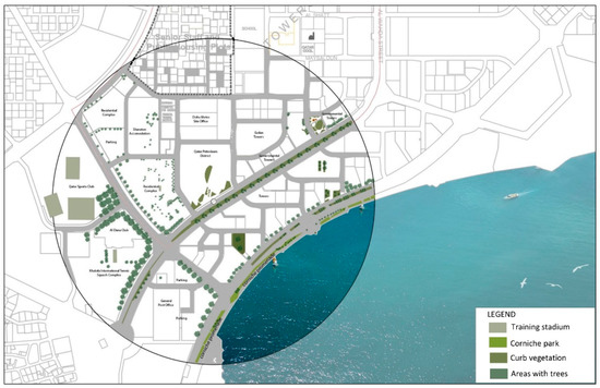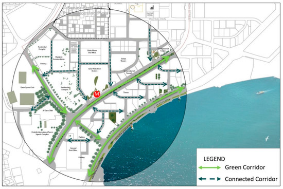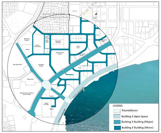 QNV 2030 specifies four pillars of development—human, social, economic, and environmental—that support an attractive and livable country. As Qatar moves forward, guidelines concerning open space, recreation, and sporting facilities have been developed, aiming for world-class open spaces and recreational areas within a greener built environment (MME, 2020). At the study site, open spaces and greenery currently constitute 39% of the total site area. These green spaces include areas around sport clubs, along the Doha Corniche, small parks among the towers, and street medians; these green areas, as presently implemented, are more decorative than functional. The collective area of green spaces and other locations that are suitable for outdoor activities should be increased in order to create a more outdoor-oriented environment. According to the United States Environmental Protection Agency [36], green and open spaces can be developed in any vacant land open to the public, including, but not limited to: