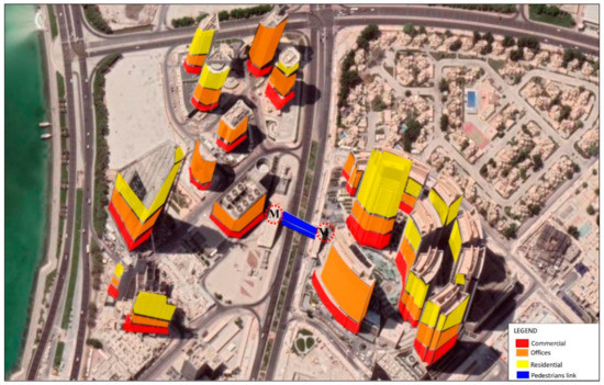 The West Bay area is well known for its architectural style that incorporates a variety of glazed high-rise buildings, enhancing the skyline of Doha and boosting the city’s image as a cosmopolitan city. At present, this area suffers from traffic issues, especially during rush hours on the main roads, which include Majlis Al Taawon Street, Al Corniche Street, and Al Markhiya Street. Building regulations only define minimums, with a minimum tower height of G + 15 and a minimum setback of 12.5 m [31,34]. Public outdoor spaces, sidewalks, outdoor activities, cafés, and shaded walkways are generally absent, limited, or of poor quality. Applying TOD concepts to the West Bay metro station area would reduce the reliance on cars and increase PT ridership. A well-connected PT network, together with attractive outdoor spaces and changes in the vertical and horizontal land uses in the area, can transform it into a vibrant and livable neighborhood.
