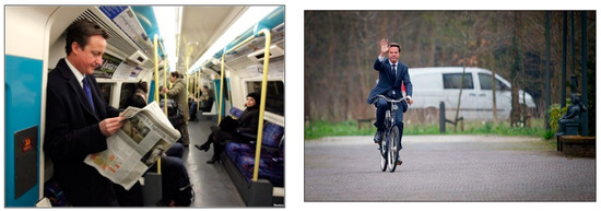 (left) David Cameron, former Prime Minister of the UK, using the London metro (Sources: The Friday Times. Adapted from [43]); (right) Mark Rutte, Prime Minister of the Netherlands, traveling by bike (Sources: Invest in Holland Network. Adapted from [44].