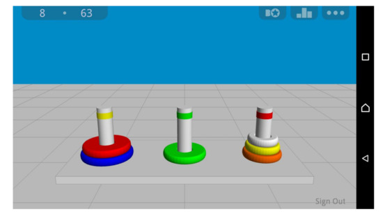 A digital version of the TOH is used, available at Google Play HANOI 3D. This program allows manipulating the disks and records the number of moves and total time in seconds required to complete the task. No experimental cognitive variation exists if either wood pieces or a digital version is used [17].