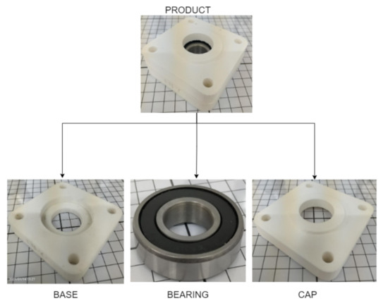 The introduced secondary task consists of collaborative assembling (CA) of a product composed of 3 components: a base, a bearing, and a cap, as shown in Figure 2. The task is classified as adding a low cognitive workload, from a human-centered perspective, because eye-hand coordinated skills are the more relevant in this task. Moreover, the assembly task shows a low level of physical risk for the human, and no action is necessary to decrease this risk.