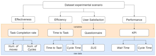 The usability of the proposed human-robot collaborative workspace’s experience (HRCWE) is evaluated on the basis of the international usability standard ISO 9241-11 [10], which takes into account both objective and subjective metrics. According to this standard, the effectiveness and efficiency of usability is evaluated through the measurement of Task to Time, i.e., is, the time in seconds to complete a task, and Task Completion rate as the percentage of tasks that users complete correctly, performed by each participant while performing the tasks. In addition to these objective measures, a questionnaire has been developed to evaluate subjective usability using the System Usability Scale (SUS), whose definition is based on psychometric methods [12].