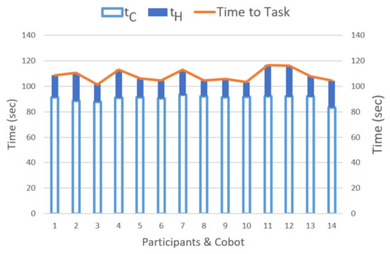 The objective for the participant in the task TOH5 is to perform as many replays as possible. The secondary task, Collaborative Assembly, is related to responding to requests for collaboration from the cobot, which are indicated by the green light of the beacon in the assembly area. The time that the human takes to place caps is saved as Wait Time and Cycle time and recorded in a data table, like the one shown in Table 4, jointly with figures for Task 1 when the operator is in the experimental scenario. In the collaborative assembly task, the activities of the participant, are: