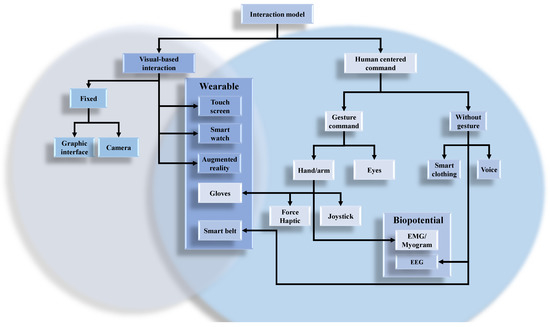 This section will present the studies that have been conducted for this purpose. Figure 1 shows a possible taxonomy for these different means of interaction depending on the support used. In this figure, hybrid method is possible such as using Augmented Reality to see the swarm, Haptic to control the structure of the swarm and electrocardiogram to control, as an example, the velocity and orientation of the swarm.