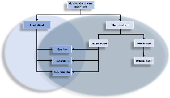 This category is the one that the majority of swarms of mobile robots must accomplish. It is divided into two subcategories: exploration/avoidance of collision, and reaching a targeted position given by an operator or by the swarm itself. The existing algorithms for achieving this objective are detailed in Section 5.