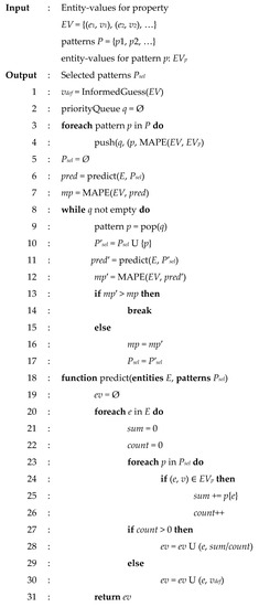 The algorithm that uses the MAPE equation can be seen in Figure 2. To start, it makes a best guess at the value given the KB and the textual pattern. This guess is the mean of the training data, their median, or 0, whichever produces a lower MAPE score. Next, all patterns are ranked based on their MAPE score for the property in question, and this ranking is iterated over. During each iteration, the MAPE score is calculated for each pattern combined with the entity in question and a list is populated of patterns that predict the value well. As soon as the MAPE value is increased with a possible pattern, the algorithm exits, and the selected list of patterns is returned [10].