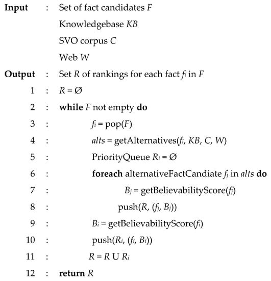 where γ is a weighting parameter between 0 and 1, controlling the relative importance of the objectivity and the co-mention scores [17]. Pseudocode for this entire algorithm is in Figure 3. As input, it takes a set of fact candidates based on the original claim, as well as a knowledge base, a set of subject-verb-object triplets, and the internet. It outputs a set of believability rankings for all of the input fact candidates.