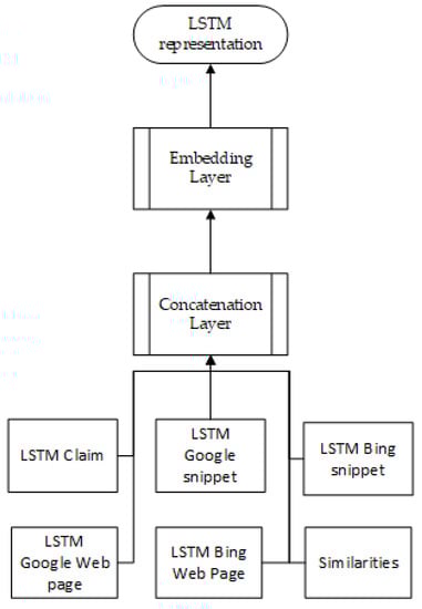 Next, comparable representations of the claim and external support data must be generated. Three similarities are calculated between the claim and snippet and between the claim and web pages. They are cosine with TF-IDF, cosine over embeddings, and containment. Embeddings are calculated as the average of the embeddings of the words using pre-trained embeddings from GloVe [21]. Also, to compare the Web pages to the shorter claim, the pages are split into sentence triplets and then the similarities are calculated between the triplets and the claims, keeping only the highest scoring triplet. The maximum and average of the three similarities over the snippets and over the web pages are used. The embeddings of the claim, the best-scoring snippet, and the best-scoring sentence triplet from a Web page are used as features. These embeddings are calculated as the average of the embeddings of the words in the text and by using LSTM encodings within a deep neural network [6]. The LSTM structure can be seen in Figure 4.