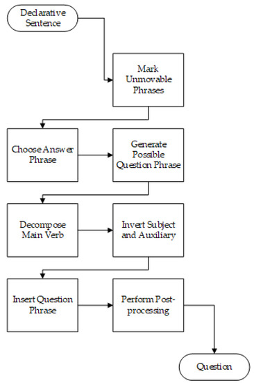 Unmovable phrases are identified by hand-generated grammatical rules. Possible answer phrases are iterated over, and each is transformed into several question phrases. Generating question phrases is accomplished by using the entity types, i.e., person, location, date, etc., and replacing them with an appropriate question word, i.e., who, where, when, etc. Decomposing the main verb does not happen for all sentences, only when an auxiliary verb or modal is not present. It decomposes the main verb into the appropriate form of “do” and the base form of the main verb and then modifies the syntax tree structure of the question appropriately. For example, the sentence “John saw Mary” transforms into “John did see Mary” before finally resulting in “Who did John see” rather than “Saw John Mary” [23]. Subject–auxiliary inversion occurs when the question is a yes–no question or when the answer phrase is a non-subject noun phrase. This allows for more natural questions such as “Following Thomas Jefferson, who was elected the 4th president” rather than “Who, following Thomas Jefferson, was elected the 4th president.” When the question is not a yes–no question, the generated question phrases are inserted into a copy of the syntax tree following any leading sentence-level adjunct phrases [23]. Finally, proper formatting and punctuation is added as a post processing step.