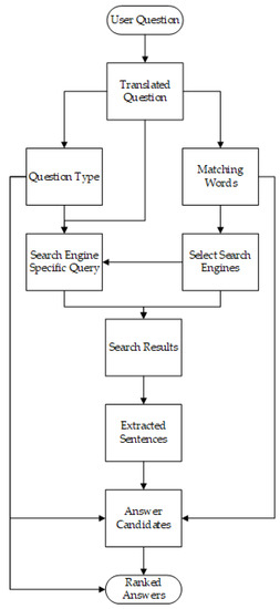 AnswerBus is an open-domain question answering system, meaning it is not restricted to a subset of question areas, that is based on sentence level information retrieval [24]. It uses web searches to provide users with answers to their natural-language questions entered in several possible languages. However, even though it can accept questions in several languages, it only searches the Web in English with an automatically translated question. The first step of the AnswerBus system is to use a simple language recognition module to determine whether the input question is in English and, if it is not, to use the AltaVista translation tool BabelFish to translate it into English [24]. This is followed by four main steps: selecting search engines to use and forming specific queries per engine based on the question, sending the queries to the search engines and retrieving the top results, extracting sentences that potentially contain answers from these documents, and ranking the answers and returning them along with URL links for the user [24]. The structure of the AnswerBus system is shown in Figure 8.