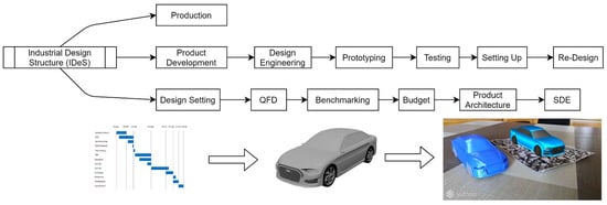 Industrial design is the most important phase in the lifetime of a product. The design stage controls the style of the components, the costs, the times of production, and the impact on the market. Because of the latter, it is important to gather all of the information possible from customers and start a new project to develop the right car concept from the beginning. Errors in this phase will lead to inefficiencies that will affect the budget. Many approaches to this problem are possible since the design stage is not simple [1]. The following paper presents a case study based on the different phases of Industrial Design Structure (IDeS) with the integration of AM and AR, dividing the process into several design steps. Using IDeS, it is possible to develop an innovative industrial product [2] by deconstructing the process into phases concerning style, design, optimization, and production. Because of this methodology, errors are reduced, and the final product result is both innovative and relatively cheap since no changes need be done after the application of the methodology itself. Moreover, the usage of breakthrough technologies such as Augmented Reality (AR) [3] and Additive Manufacturing (AM) [4] show that non-expensive solutions for virtual prototyping exist, and they can be implemented in the IDeS process. As previously reported by Donnici et al. [5], using this methodology, a link is indeed created between the design structure and company organization, dividing the design process into three macro-phases: Setup, Development, and Production (Figure 1).