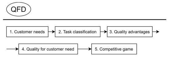 The Quality Function Deployment (QFD) [13] is a methodology that focuses on the aspects that pursue customer satisfaction in order to establish quality that must be ensured. The QFD forces the manufacturer to connect the key characteristics of the products to the needs of the customer. Because of this, it is applicable to different sectors [14,15] and has a number of applications in transport development [16] that have also been applied to automotive servicing [17]. QFD allows movement from the definition of “conformity to use” to “accordance with specifications”, identifying the priorities of the characteristics in order to obtain a product or service that satisfies the customer (Figure 2).