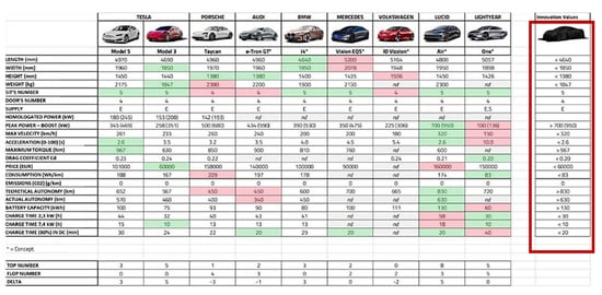 Nevertheless, the compared cars are electric models of the Executive cars segment that are already in production or in prototypes. Figure 3 shows all the Benchmarking Analysis for the various competitors that were analyzed and the most innovative products.